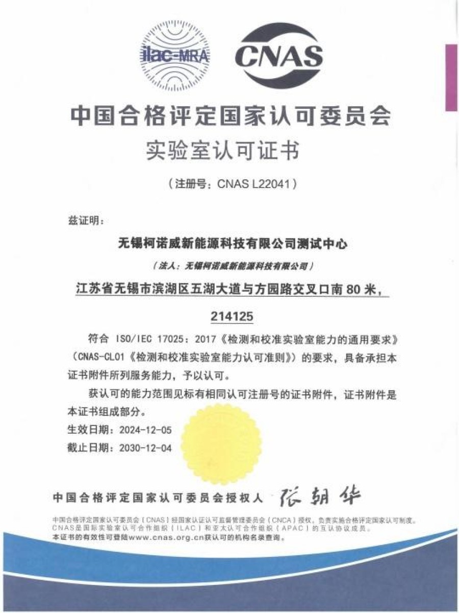 12月5日,无锡柯诺威新能源科技有限公司测试中心顺利通过中国合格评定国家认 ...